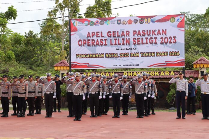 BINTAN | Kapolres Bintan AKBP Riky Iswoyo, S.I.K, M.M dan Bupati Bintan Roby Kurniawan, S.P.W.K memimpin Apel Gelar Pasukan operasi Lilin Seligi 2023 dalam rangka pengamanan Natal 2023 dan Tahun Baru 2024, Kamis (21/12/2023).