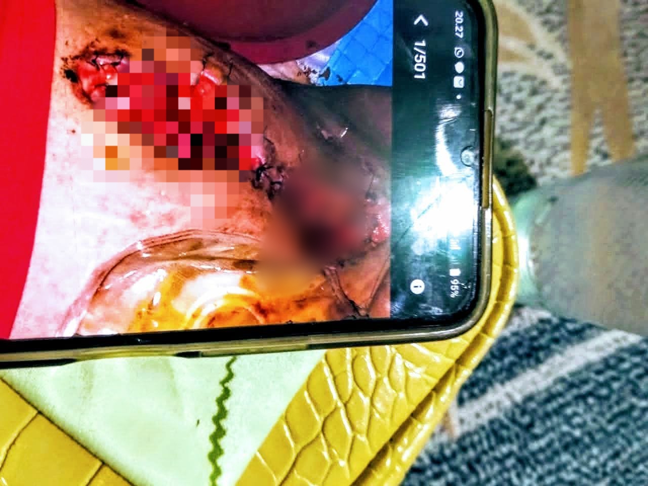 Setelah dipulangkan, kondisi pasien semakin memburuk. Luka operasi yang seharusnya menutup justru menganga dari ulu hati hingga bagian atas pusar, bahkan diduga mengeluarkan feses dari luka terbuka. Hal ini mengindikasikan kebocoran pada saluran pencernaan bagian bawah (usus), yang seharusnya menjadi kondisi darurat medis dan membutuhkan penanganan segera.
