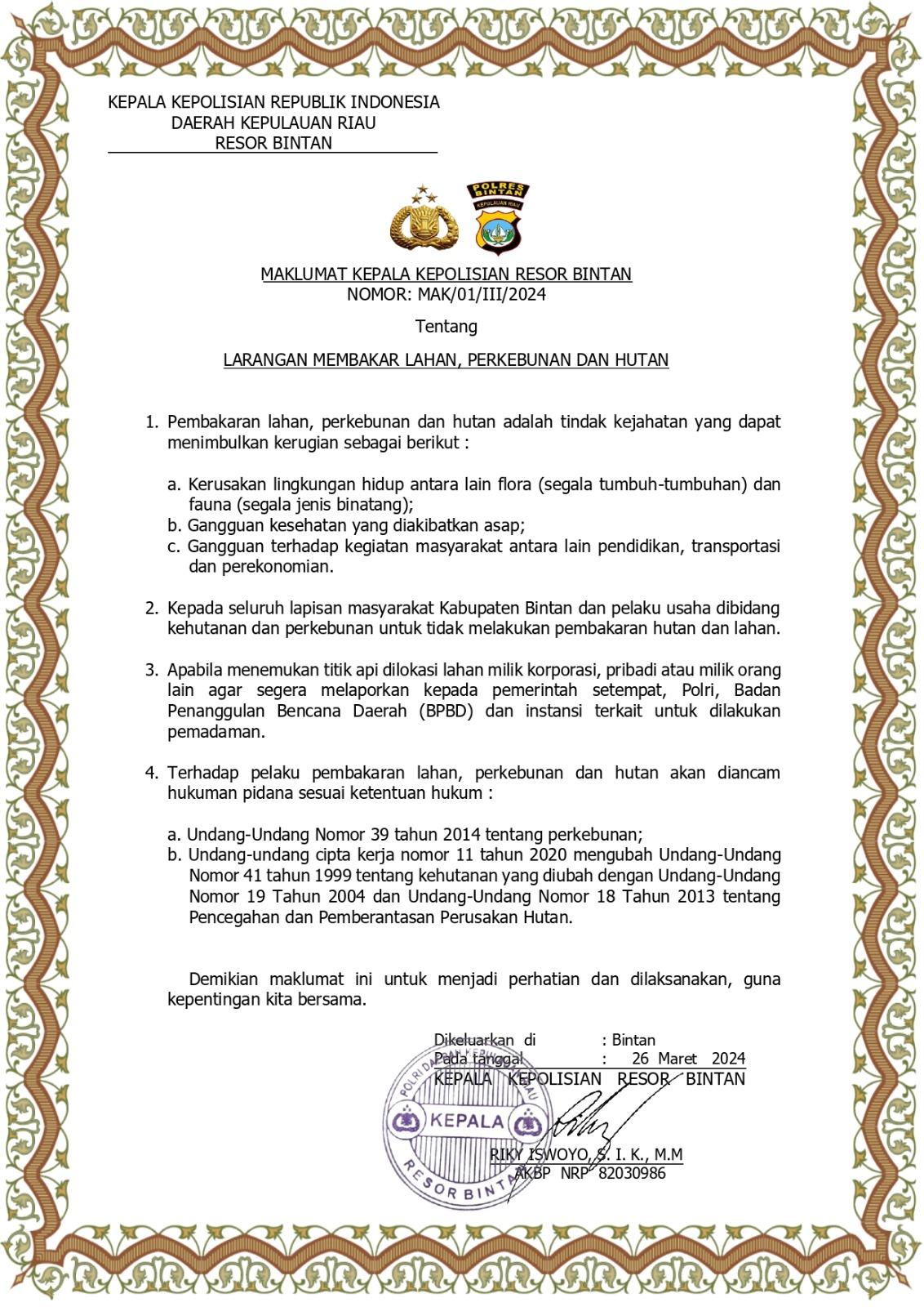 Maklumat ini dikeluarkan oleh Kapolres Bintan sehubungan dengan mulai maraknya terjadi kebakaran hutan dan lahan di wilayah kabupaten Bintan.
